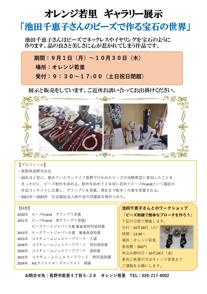 オレンジ若里のギャラリーで「池田千恵子さんのビーズで作る宝石の世界」が始まりました。
