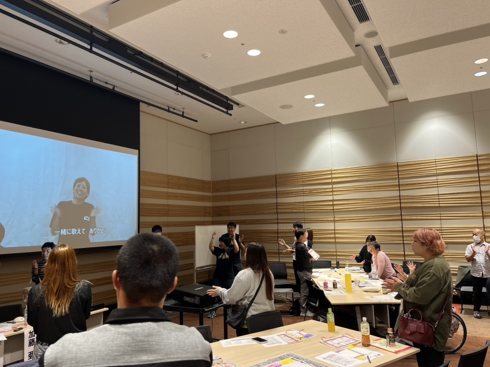 会の最後に、みんなで「手のひらを太陽に」、そして今回のきょうされんのテーマ曲「まんまの笑顔を咲かせよう」を歌いました。一体感があり、力強い歌声に感動しました。同時に、表現の大切さを実感しました。