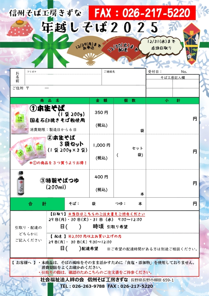 🚚 今年は 12月30日まで配達 を行い、さらに 大みそかの昼12:00まで そば工房にてお受け取りいただけます。
